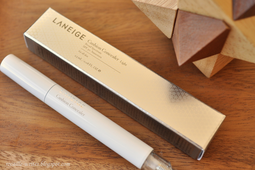 With the increasing popularity of cushion foundations (read my review of Laneige's BB Cushion here), many brands have decided to go all out on the cushion technology, introducing cushion blushers, gel eyeliners, eyeshadows and more. Laneige is definitely on top of that trend with their Cushion Concealer Broad Spectrum SPF 30* ($20 for 2.5 ml at Target), available in Light (which I have here to show you) and Medium.
